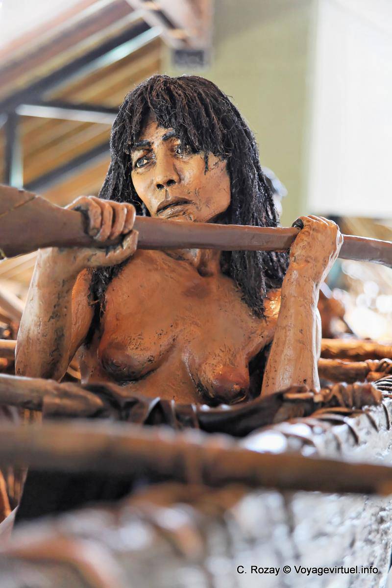 Reproduction d'indienne tehuelche en train de ramer, Parque Nacional Tierra del Fuego, Ushuaia - Argentine