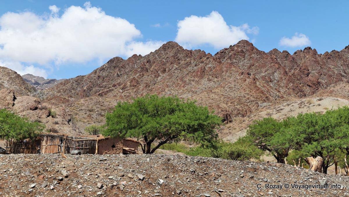 Maisonnette et arbres dans l'aridité, vallée Calchaquies, Ruta 40 - Argentine