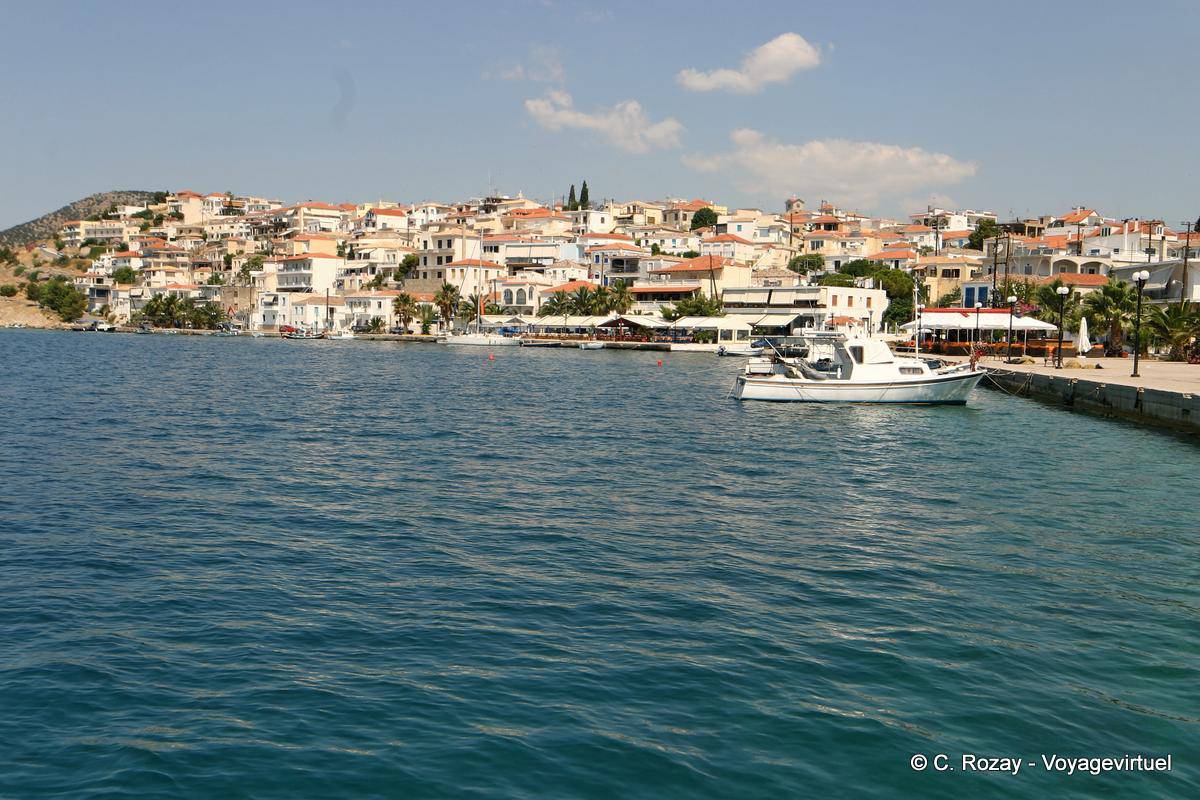 - ERMIONI est une petite ville tranquille, située dans le sud-est de l'Argolide (Péloponnèse). Bètie sur une petite péninsule elle donne accès à la mer des deux côtés. Dans la baie située au nord,le Flying Dolfin arrive directement du Pirée (Athènes). (Claude)