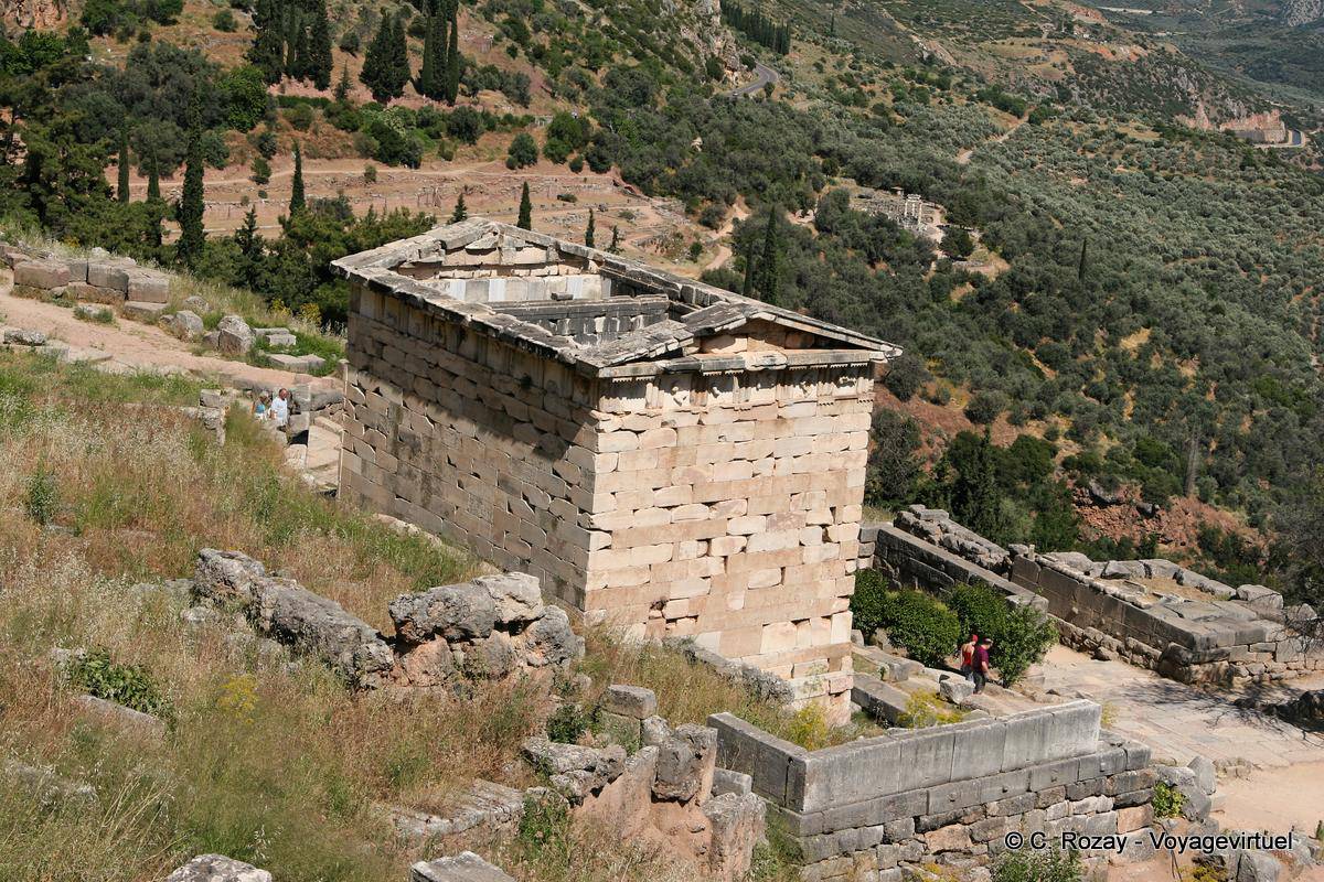 [Cliquez sur la photo pour la voir en grand format] Panorama du Trésor Delphes Delphi - Grèce delphes-delphi-122 - 15 / 20 (6 votes). Votre note =>Ecrivez un commentaire en cliquant ici. Vue sur le Trésor des Athéniens depuis le haut. (Claude)