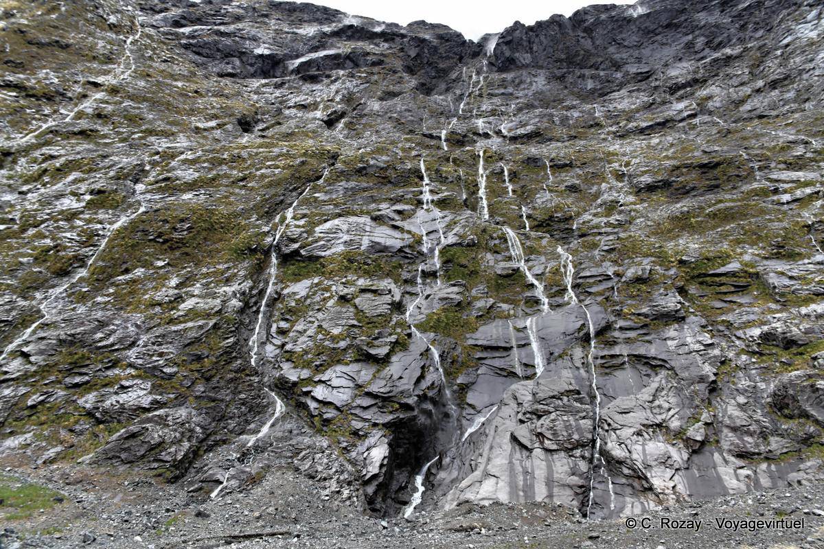 Cascades sur la falaise, Homer tunnel, Road Te Anau to Milford Sound, Southland - Nouvelle-Zélande
