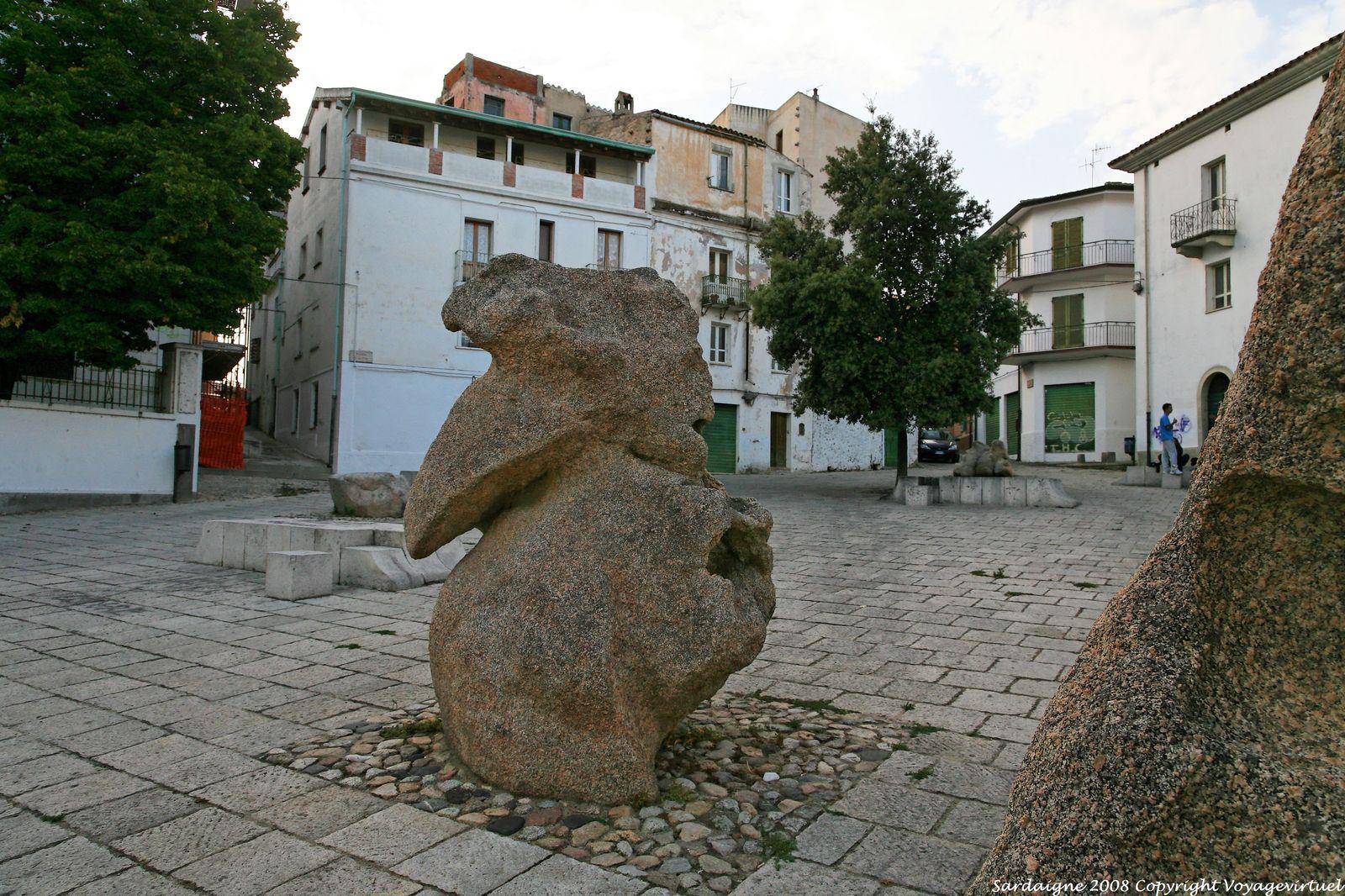 Façades blanches et granit, Nuoro, piazza Sebastiano Satta, sculpture Constantino Nivola - Sardaigne
